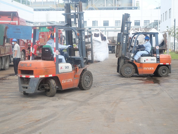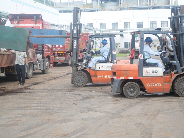 在暫存庫前,現(xiàn)場工作人員不畏高溫,一趟又一趟地來回裝卸物料,叉車司機安全帽里的頭發(fā)早已被汗水浸濕,但他們?nèi)晕从幸唤z松懈,只為保證到廠物流車輛順利完成卸車。