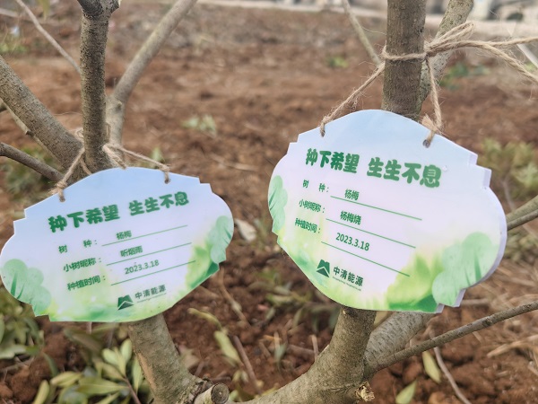 在栽種現(xiàn)場,職工們配合默契、忙碌有序,或提著水桶、或捧著小樹苗、或端著鐵鍬忙碌在植樹間,員工們還給自己種下的小樹命名,為自己種的樹苗賦予了更多的意義。經(jīng)過一個下午的勞動,楊梅、枇杷、紅美人等40多棵樹苗順利在安吉光伏項目“安家落戶”。