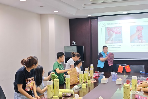 隨后,在老師手把手的指導(dǎo)下,職工們興致盎然地動(dòng)手實(shí)踐,親手將艾草等天然材料填充、捆扎成型,制作出一個(gè)個(gè)兼具實(shí)用與美觀的艾草養(yǎng)生錘。